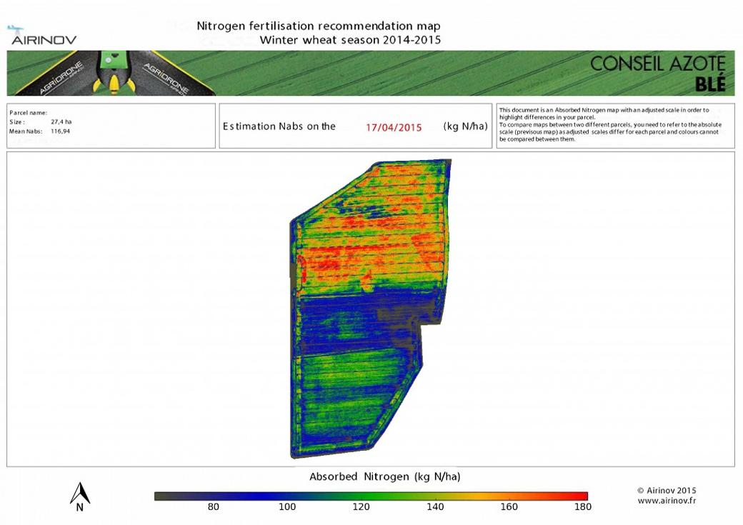 Airinov gebruikt de eBEE drone van zusterbedrijf Sensefly, uitgerust met een geavanceerde, in-huis ontwikkelde multispectrale camera, voor het meten van de reflectie van het gewas in verschillende golflengtes. Door middel van speciaal ontwikkelde agronomische modellen worden de data omgezet naar betrouwbare adviezen voor de akkerbouwer. Bovendien geven de kaarten veel inzicht in de variatie binnen een perceel.