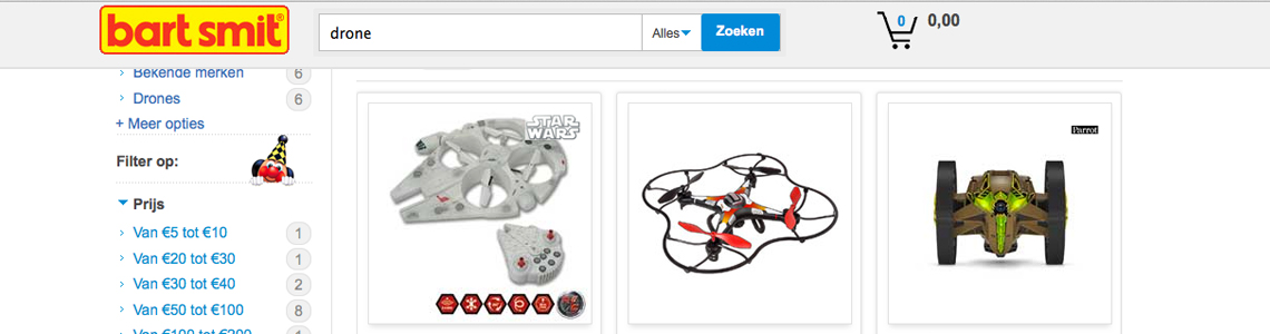 Bart Smit heeft een zeer breed assortiment met speelgoed en entertainment. Zo verkopen zij speelgoed voor de allerkleinste en bieden zij ook de bekende spelcomputers van Sony, Microsoft en Nintendo aan. In de categorie remote control speelgoed heeft Bart Smit sinds 2015 ook drones in het assortiment.