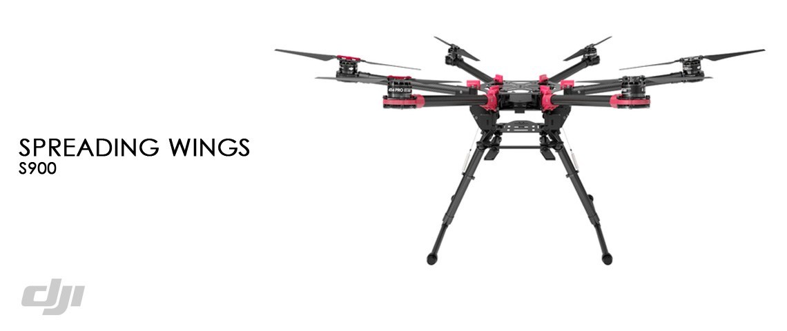 DJI Spreading Wings S900 is een Almost Ready to Fly-hexacopter-platform ontwikkeld voor professionele luchtfotografie. Het systeem kan geheel naar eigen wens worden uitgebreid met een flightcontroller, camera en gimbal naar keuze.