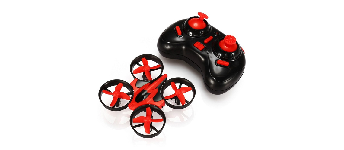 De Eachine E010 is voordelige drone die eenvoudig te besturen is. De drone is vooral ontworpen voor indoor vluchten en is voorzien van een beschermende rand. Hierdoor blijft de drone vliegen na een botsing. De Eachine E010 heeft een afmeting van 9.5 bij 9.5 centimeter en weegt slechts 20 gram.