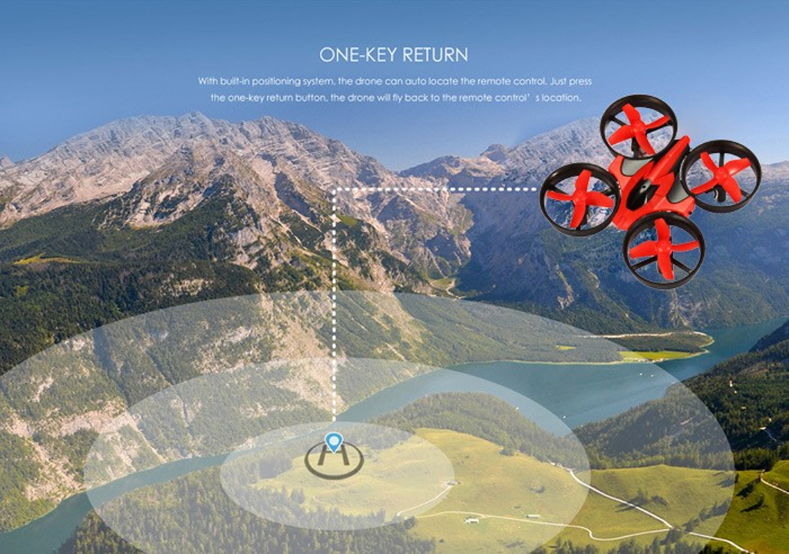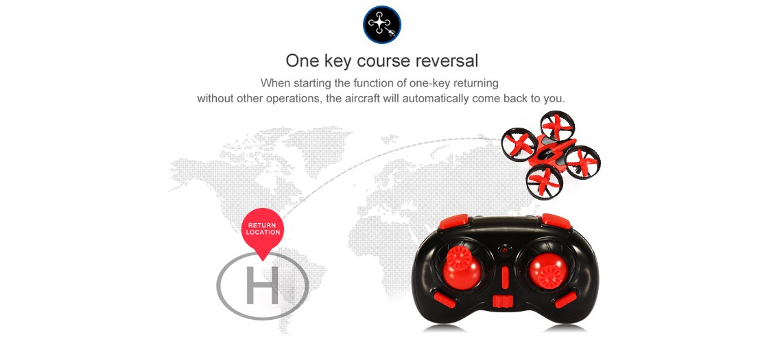 Met de Eachine E010 voer je eenvoudig vette tricks uit. Door slechts een druk op de knop rolt de drone 360 waarna je gewoon weer verder vliegt. Daarnaast beschikt de Eachine E010 over een compass mode. Hierdoor weet de drone precies waar je staat en hoef je geen rekening te houden met de voor- of achterkant van de drone. Wil je dat de drone uit zichzelf terug vliegt naar het vertrekpunt kan dit door een simpele druk op de knop.