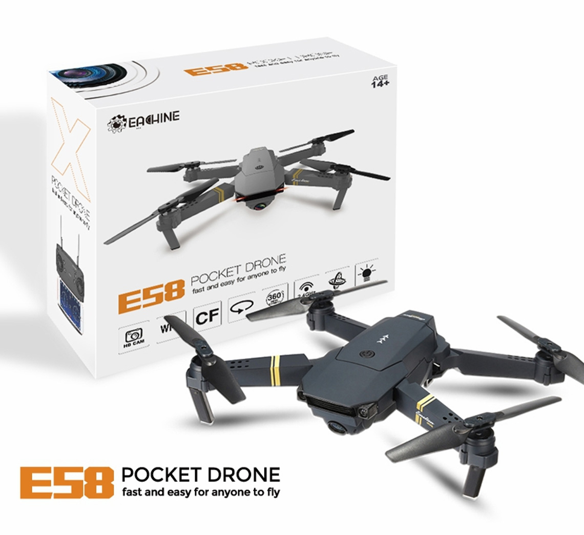 De Eachine E58 is een ready to fly drone voor zowel in- als outdoor vluchten. De drone heeft opvouwbare armen waardoor hij slechts 12.5x7.5x5 cm groot is wanneer hij is opgevouwen. De drone weegt 360 gram.