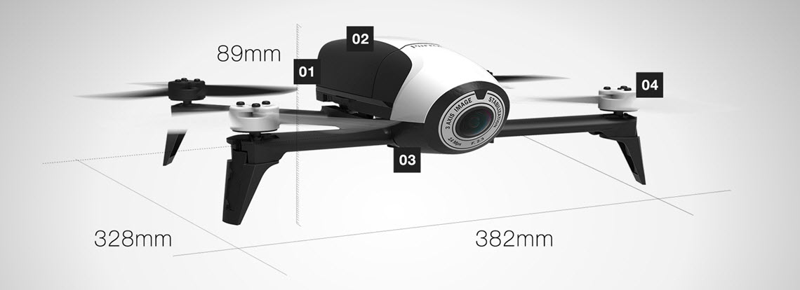 De drone is uitgerust met 4 armen, elk voorzien van een krachtige motor. Het uiteinde van iedere motor is voorzien een 2-blade design propeller. De propellers zijn ontworpen voor een maximaal resultaat van vliegduur ten opzichte van het accuverbruik van de motoren.