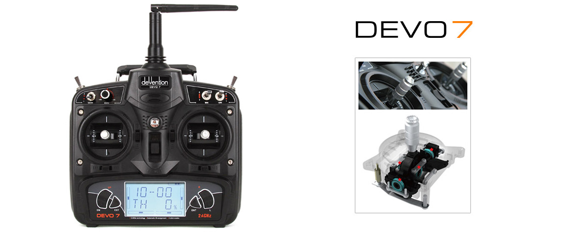 De Ready To Fly (RTF) set van de Walkera Runner 250 quadcopter wordt geleverd inclusief 2.4GHz DEVO F7 Remote Controller. Via de 2.4Ghz frequentie stuurt de zender - Remote Controller - de instructies door naar de ontvanger op de drone. De afstandsbediening wordt gevoed door vier AA batterijen.