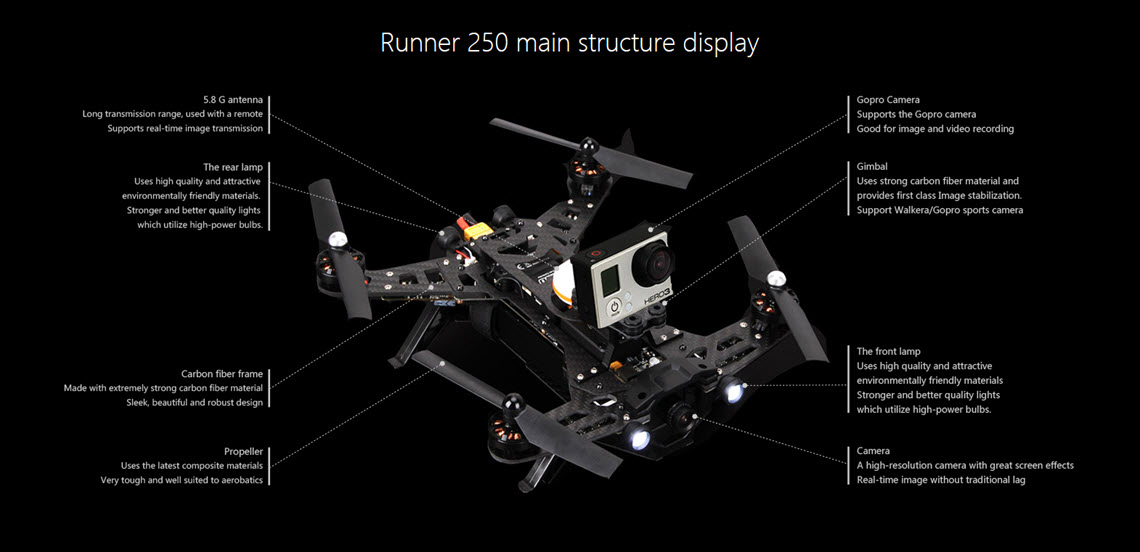 Het frame van de Walkera Runner 250 quadcopter is een robuuste constructie dat tegen een stootje kan. Het gestroomlijnde design in combinatie met de zwarte kleur geeft de racer een stoere uitstraling. Dankzij de gebruiksvriendelijke bediening is deze drone geschikt voor beginners en gevorderden. Alle flight-parameters zijn door Walkera exact op elkaar afgestemd wat resulteert in een uiterst stabiele vlucht.