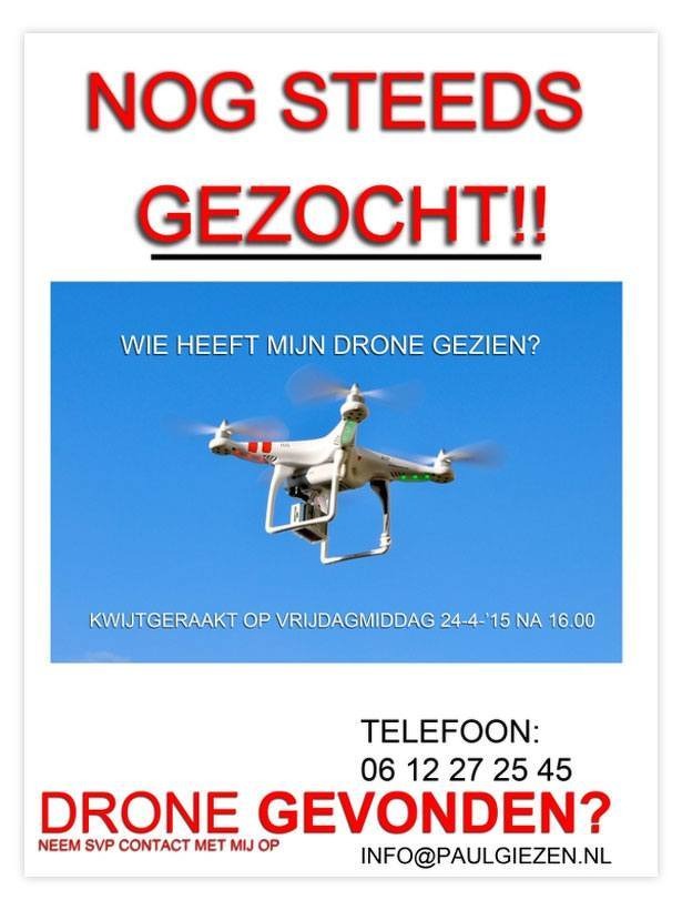 Giezen maakte flyers, posters en foto’s van zijn vermiste DJI Phantom. 'Wie heeft mijn drone gevonden?', staat op flyers en A4-tjes die in brievenbussen vallen in de buurt van de 'rampplek'.