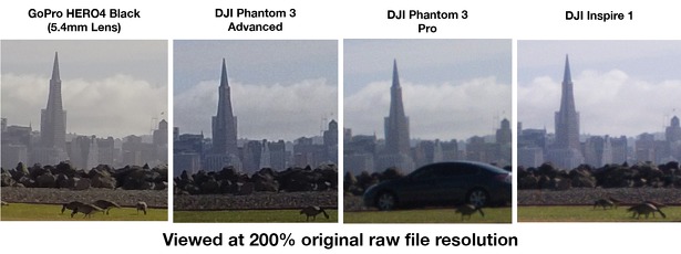 DJI Inspire 1: 4K DJI Phantom 3 Professional: 4K DJI Phantom 3 Advanced: 1080p/60 GoPro Hero4: 4K De camera van de Phantom 3 Advanced heeft in dit rijtje de minst favoriete stats, maar het beeld is zeer vergelijkbaar met het beeld van de camera's van de Pro-versie en Inspire 1.