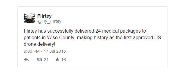 17 juli 2015 zal de boeken ingaan als de dag van de eerste dronebezorging. De vlucht vond plaats in de Verenigde Staten. De vlucht werd gebruikt om 24 pakketten met dringende medicijnen af te leveren bij een gratis kliniek in Wise, Virginia. De vlucht is vlekkeloos verlopen.